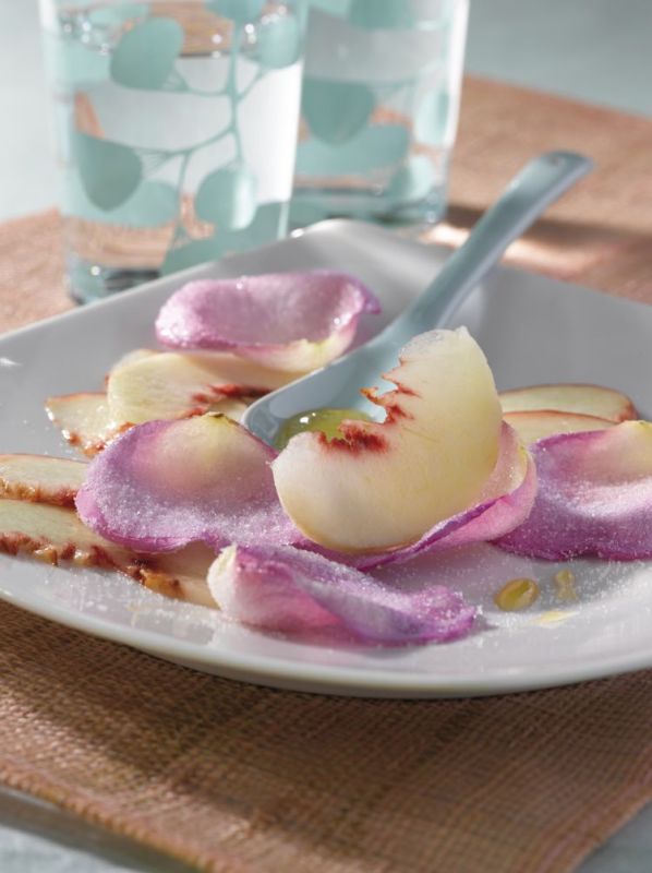 - Carpaccio de pêches blanches et pétales de rose cristallisées