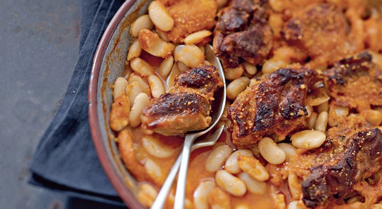 Dans une cocotte, faites revenir les morceaux de viande avec de l'huile, puis ajoutez les oignons et l'ail émincés. Incorporez les tomates, ajoutez le jus de cuisson des haricots et laissez mijoter pendant une heure.